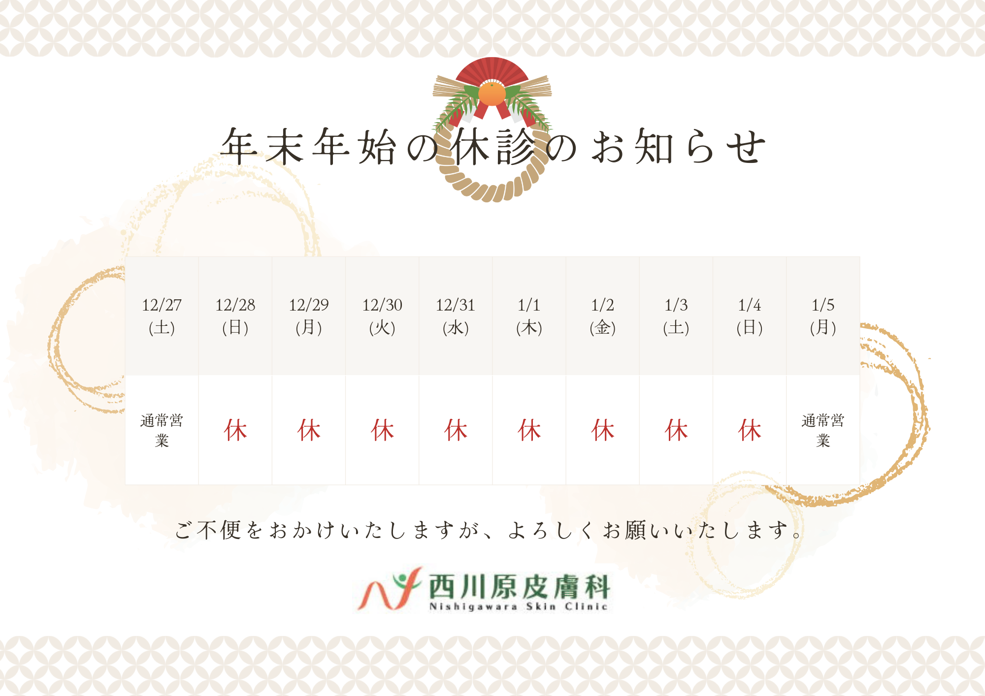 当院は誠に勝手ながら2025年12月28日(日)〜2026年1月4日(日)まで休診とさせていただきます。